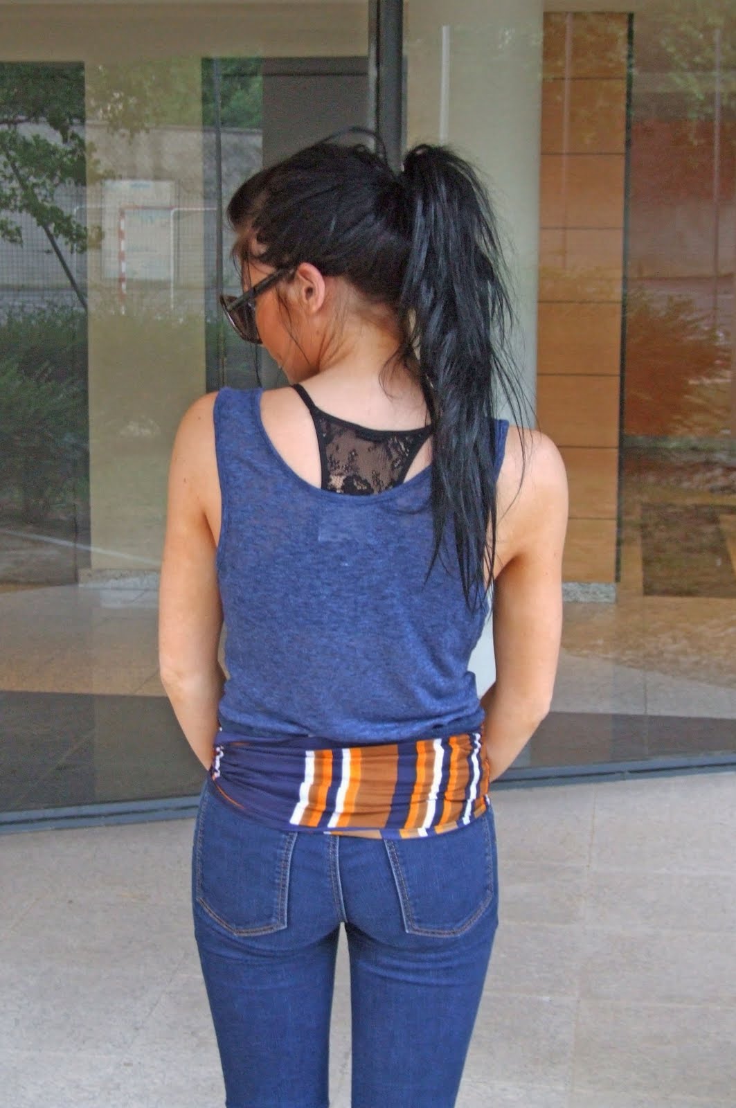 Slim taille haute, débardeur en lin kaki, ceinture tressée, sandales compensées, blazer et sac bourse